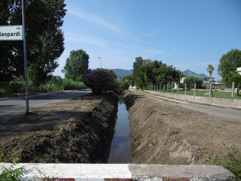 Pantano Marino A.T.O. Tratto dalla strada provinciale via Leopardi a valle e a monte Trinciatura, riescavo alveo e ripristino corpo arginale Agosto 2018